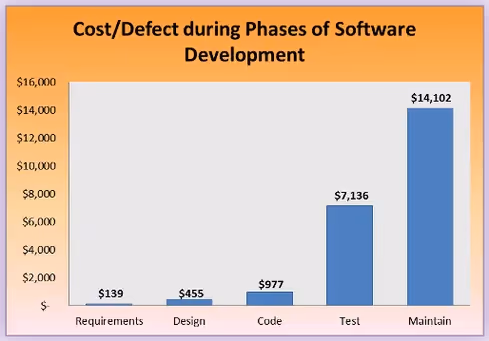 The earlier in the SDLC that vulnerabilities are addressed, the less damage they can cause and the less costly they are to remediate. According to security expert Jim Routh, who previously served as Chief Security Officer at Aetna and CISO at MassMutual, the cost per defect during the phases of the SDLC rise to greater than $14,000 if performed during maintenance mode after the software is released to production. Costs can be halved if addressed during testing and they can be 14 times less expensive if addressed during the coding phase.