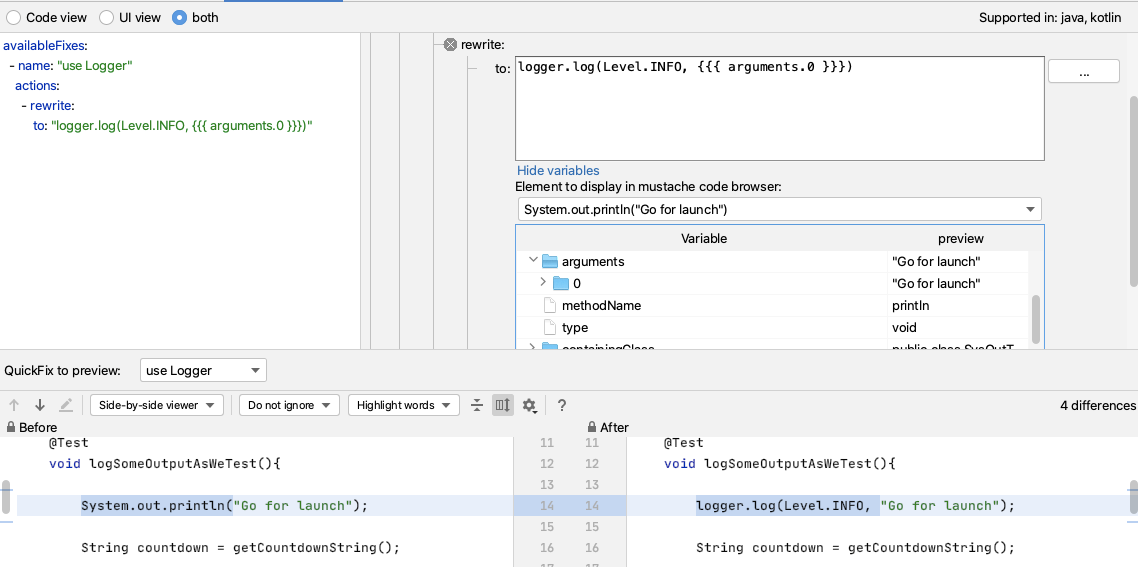 Note that I changed SysOutTest to be a mustache variable so that it picks up the name of any class I use this recipe in. And again, I didn't remember the mustache syntax, I used the GUI Show Variables to find the replacement I needed.