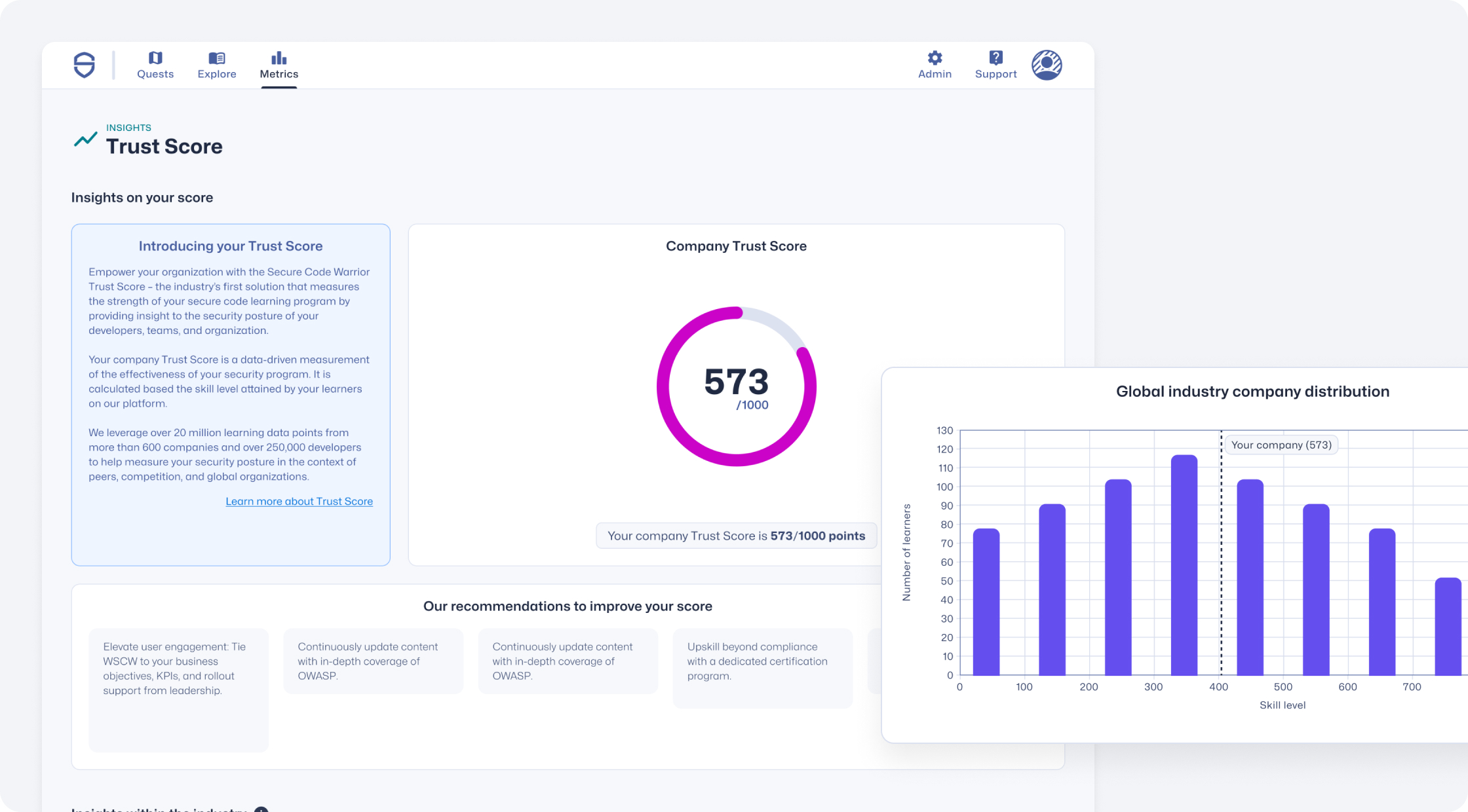 SCW Trust Score is an industry-first solution that leverages a dynamic algorithm, harnessing insights from over 20 million learning data points collected from 600+ companies and 250,000 learners. It considers an array of learning activities completed within our platform, such as the depth of knowledge acquired about the OWASP Top 10. These unmatched insights help organizations measure their performance against others with confidence.